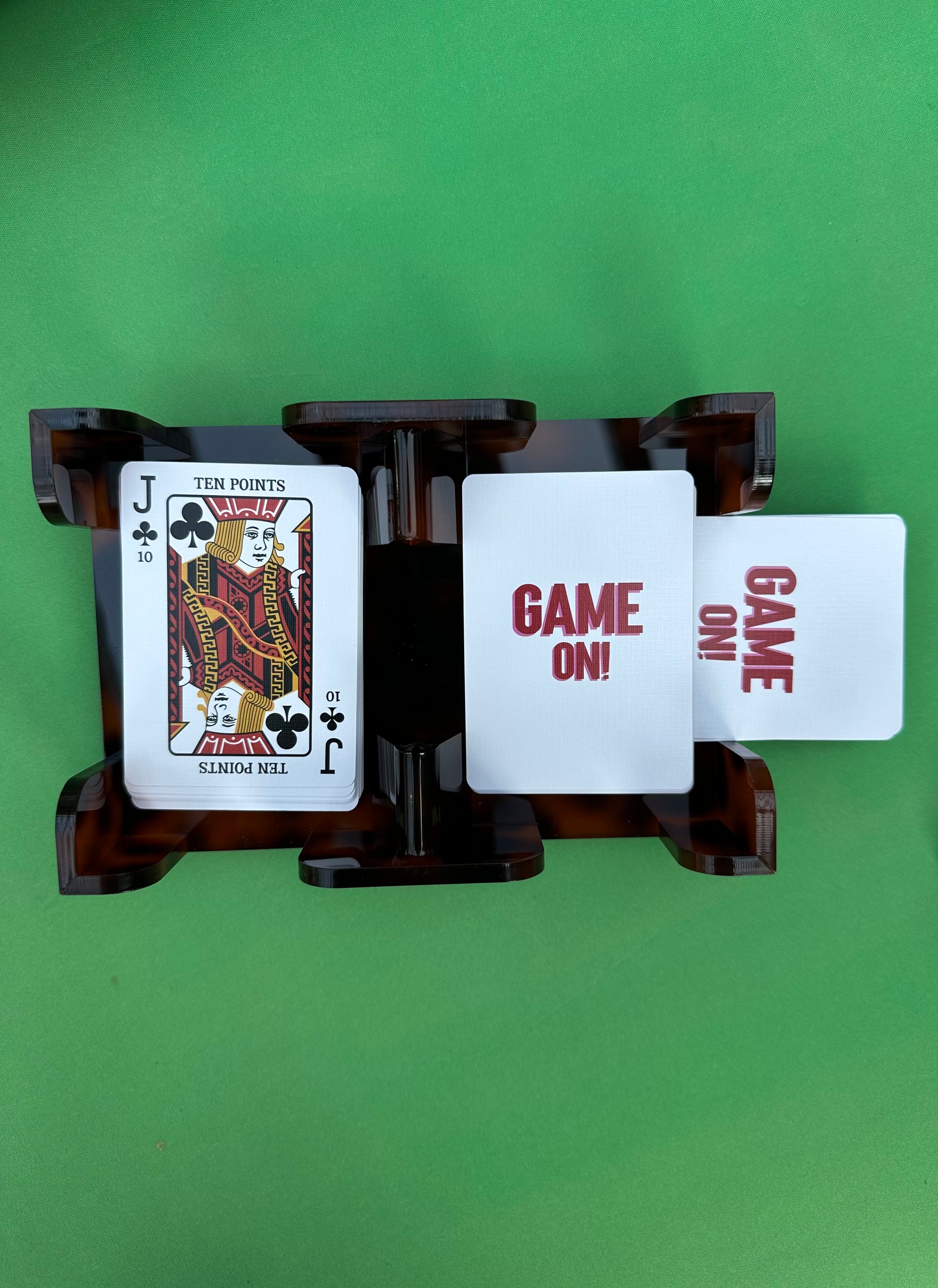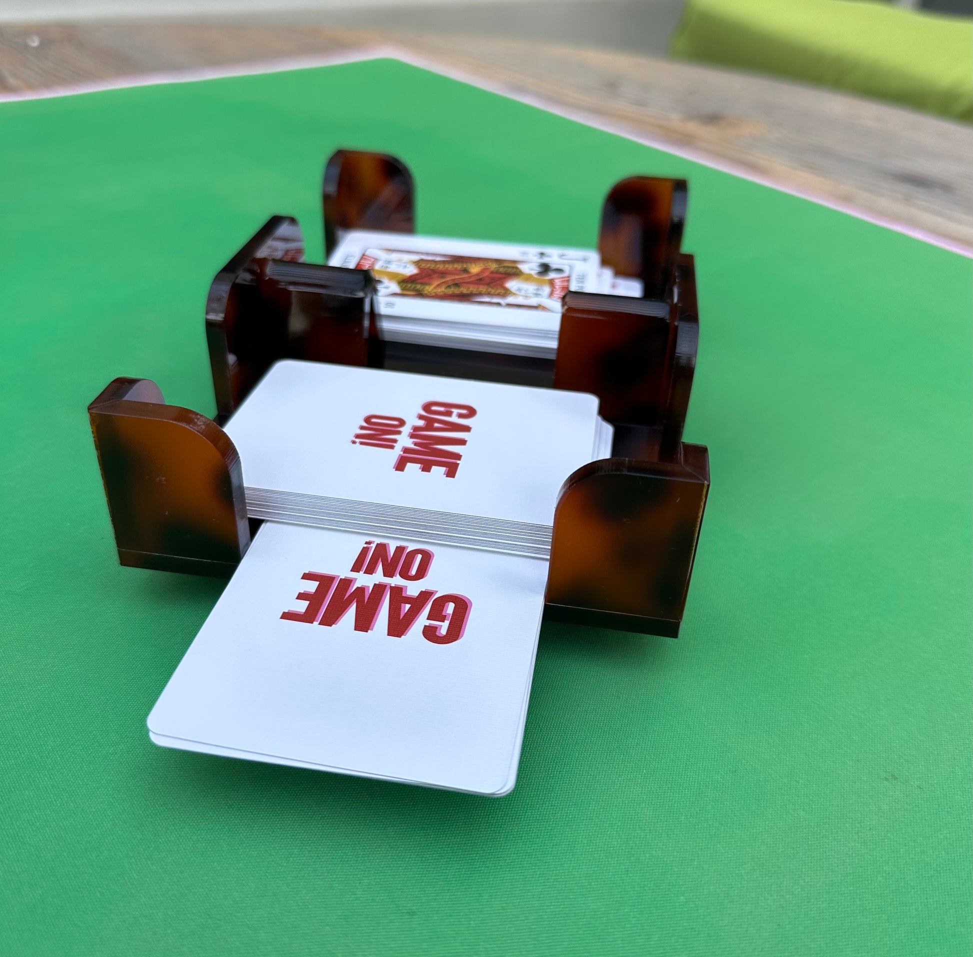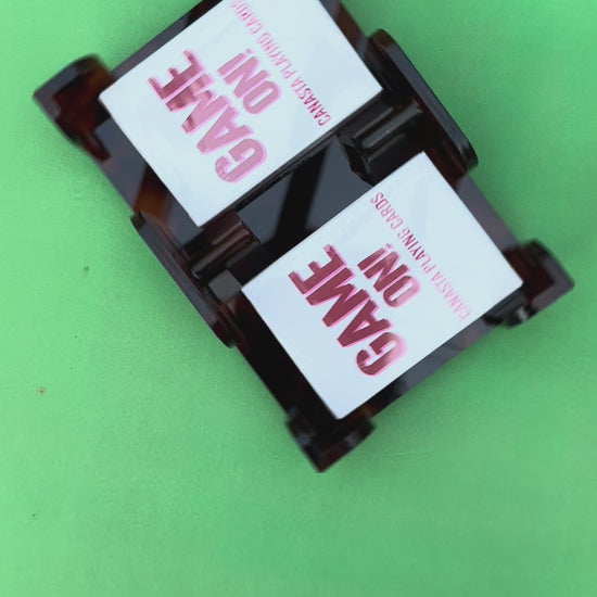 Everything you need to play canasta in our signature Canasta to go…canvas bag. This comes complete with a classic tortoise acrylic card spinner, two decks of canasta playing cards (with point values for scoring), a 50 page score pad. This is perfect gift for your canasta playing besties or to elevate the look of your own game table.