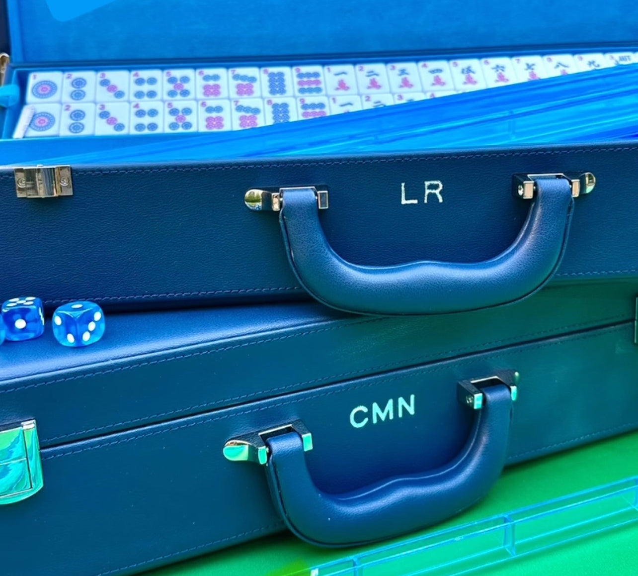Our blue and white lovers classic!! The case opens to a complete standard-size Mahjong set. It comes with a bright blue velvet lined interior, 162 classic Mahjong tiles, 4 blank tiles, 4 blue lucite pusher/racks, blue dice, chips, and an instruction book. The case is made of vegan leather. This comes personalized with a three letter monogram of your choice. This looks great on any coffee table!!